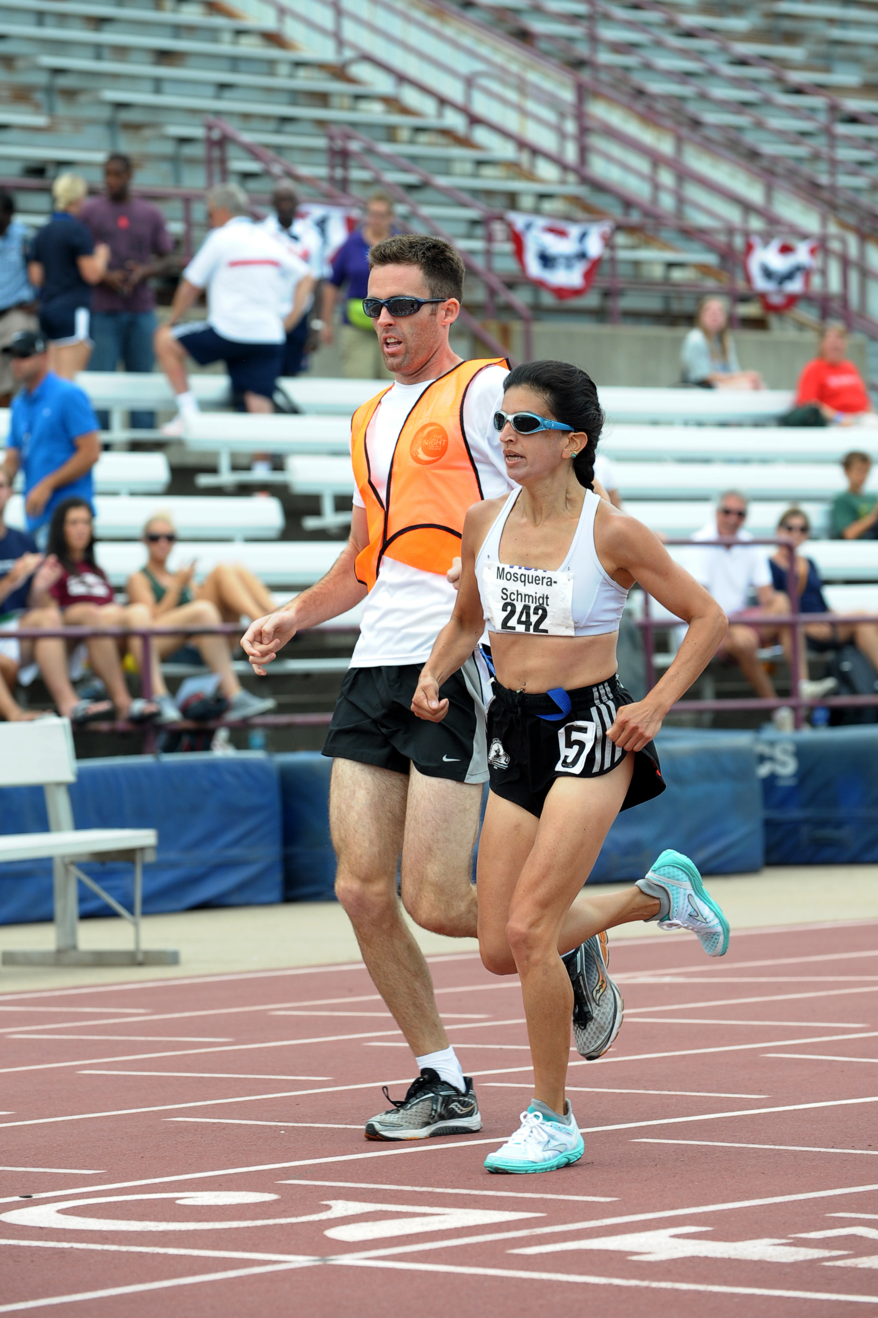 My guide Bryan and I were ready! We had met in Mesa Arizona, about a month before, at the Dessert Challenge Games. He picked up guiding in a matter of seconds, and the next thing I knew we had run qualifying times in all three distances to get to National Trials! So here we were in Indianapolis, at the Michael A Carroll stadium, which has seen a lot of famous runners on its track and field.
