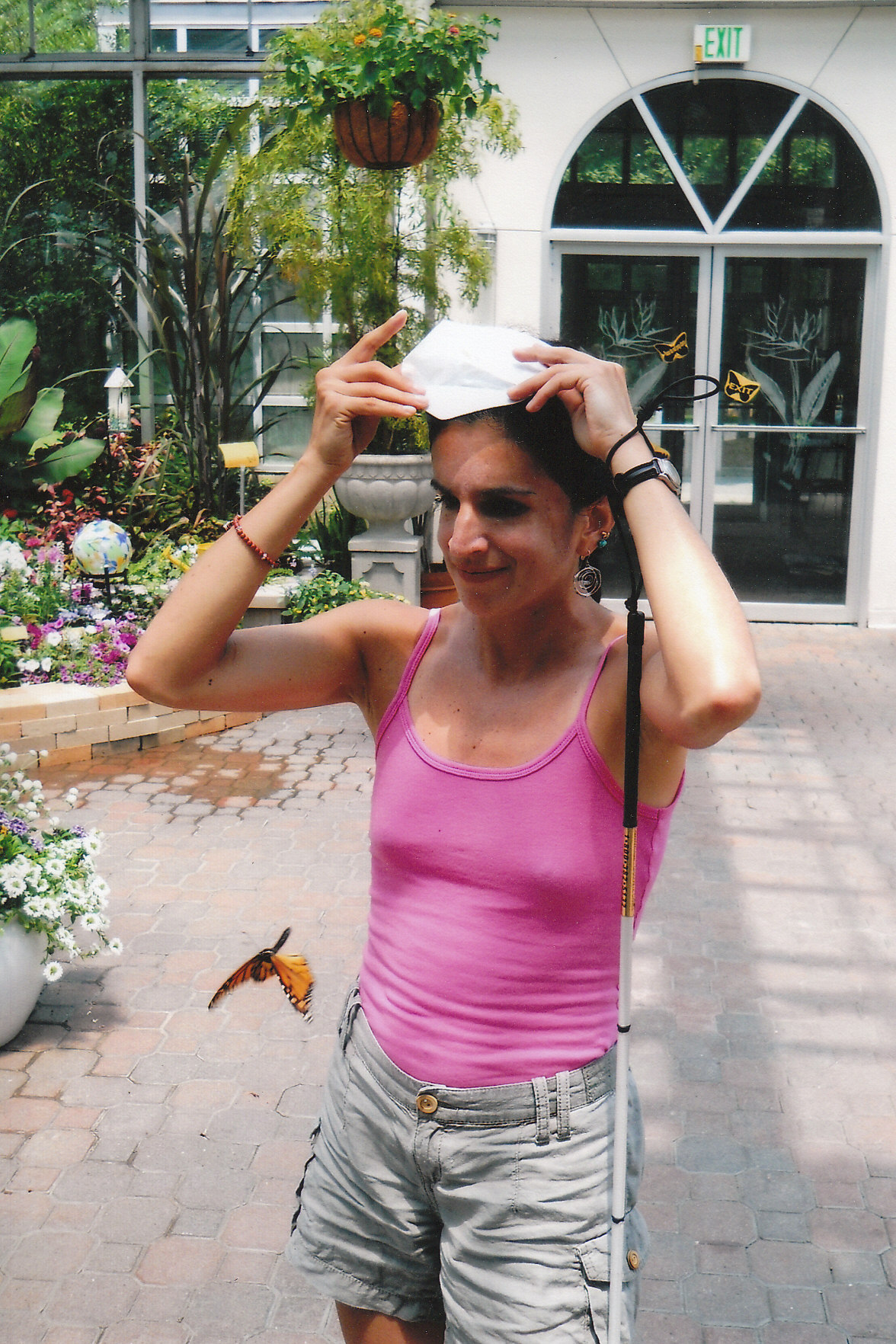 With an off day between the 200 Meters and the remaining 1500 Meters and 400 meters event, it was time to practice starting out of the blocks. We’d have to do it again for the 400 Meters event. My husband John set me up on the field grass/astroterf first; if I fell while coming out of the blocks, I’d have some padding underneath me! After about 15 minutes of practicing on my own, it was time to try the start tethered to Bryan. This was then followed by moving out onto the track itself…Talk about practice and focus- The rubber surface of the track is not as forgiving as the soft grass surface, so I really had to think about not tripping and yet also not letting my body pop up straight in the air off the blocks. The best way to describe this “starting out of the blocks” is to think about keeping your body somewhat low to the ground and at a forward angle so that you can be more like an arrow flying through the air…And remember, coordinate movements with your guide so that arms don’t hit the tether and accidentally disconnect us from each other! Well, after about an hour’s worth of practice, it was time for a break and a bit of site seeing. We managed to check out the Speed Way, step on the track itself, and then went off to spend a little time in the midst of nature at the Botanical Gardens, and even had a chance to release butterflies into the sky.
