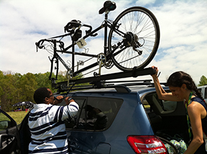By Saturday morning, I was packing up my favorite food and snacks for the trip, and my breakfast for race day – 10 grain cereal with oats, flax, fenugreek seeds, chia seeds, barley, brown rice, plus almonds, blueberries, cinamon and honey! Then it was time to load the car up, and put Louie, the tandem, up on the bike rack. While John had explained the process to me, this was my first time actually doing it. With Jabou’s help, some nerves b/c we didn’t want to make any marks on the car, we secured Louie on the bike rack, and we were off!